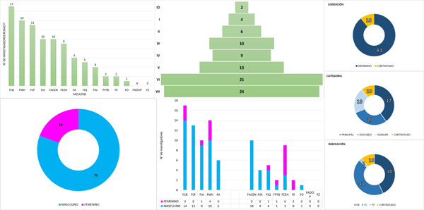 Es destacable que el 89 % de los investigadores ostentan la condición de docentes ordinarios, lo que garantiza la sostenibilidad de las líneas de investigación a largo plazo. Asimismo, la distribución por niveles evidencia una madurez en la calidad científica, con: 2 investigadores distinguidos (élite), 4 en el nivel I, 6 en nivel II, 10 en el nivel III, 9 en el nivel IV, 13 en el nivel V, 25 en el Nivel VI y 24 en el Nivel VII, los cuales demuestran bases sólidas para el ascenso a categorías superiores.